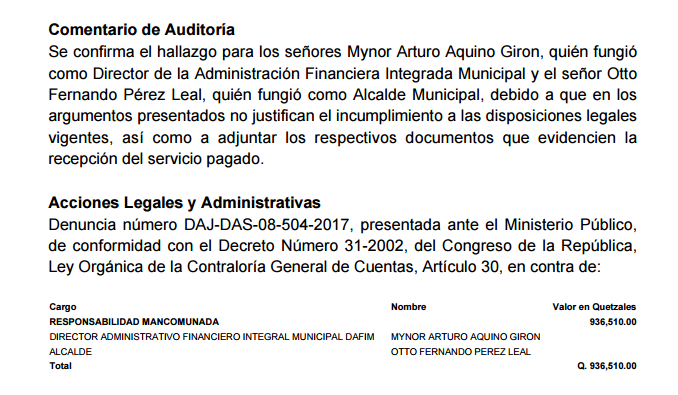 En la denuncia también fue incluido el director administrativo financiero integral municipal, Mynor Arturo Aquino Girón, quien habría firmado los cheques.