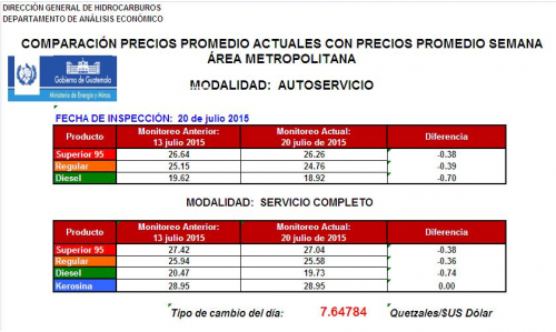 Precios promedio en el área metropolitana: Superior Q26.26 Regular Q24.76 Diésel Q18.92 p/galón en autoservicio #traficogt