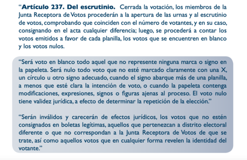 El voto en blanco, aquel en que la gente llega y no marca la papeleta, no cuenta como voto nulo. "Si alguien quiere votar nulo, que raye la papeleta" . Quezada recalca que quien quiera emitir su voto a favor de alguno de los candidatos debe ser cuidadoso en no salirse de la casilla donde está el símbolo del partido del candidato.