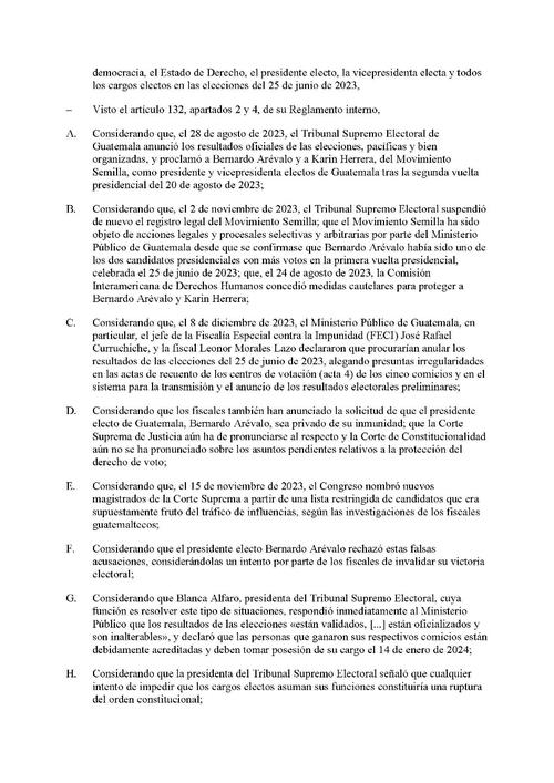 "Pide a las autoridades competentes, en particular a la Corte de Constitucionalidad, la Corte Suprema de Justicia, el Tribunal Supremo Electoral, el Congreso y el presidente Alejandro Giammattei, que tomen medidas para preservar el orden constitucional y el Estado de Derecho, que rechacen los intentos inaceptables de invalidar los resultados electorales, que garanticen el respeto de la voluntad expresada por los ciudadanos guatemaltecos con sus votos y que velen por el respeto de sus derechos civiles y políticos, su integridad y su seguridad, incluido el derecho de los cargos electos a asumir debidamente sus funciones, de conformidad con las normas internacionales y las leyes guatemaltecas", detalla la resolución.
