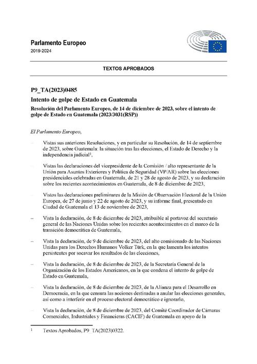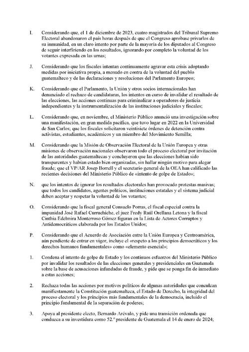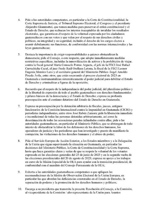 "Pide al Consejo, a este respecto, que adopte inmediatamente medidas restrictivas específicas, incluidas la inmovilización de activos y la prohibición de viajar, contra la fiscal general María Consuelo Porras Argueta, el jefe de la FECI José Rafael Curruchiche Cacul, el juez Fredy Raúl Orellana Letona, la fiscal de la FECI Leonor Eugenia Morales Lazo y el secretario general del Ministerio Público Ángel Arnoldo Pineda Ávila, entre otros, que están socavando el proceso electoral de 2023 en Guatemala e instrumentalizan sistemáticamente el poder judicial para debilitar el Estado de Derecho y criminalizar a figuras de la oposición".
