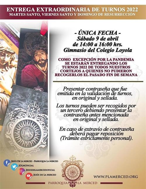 El sábado 9 de abril en horario de 14:00 a 16:00 horas la Parroquia La Merced entregará los turnos a los feligreses que no pudieron acudir en la fecha programada.