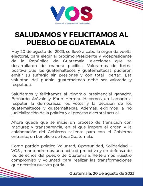 Entre ellos, el partido político Voluntad, Oportunidad, Solidaridad (VOS) que por medio de un comunicado felicitó a Semilla e hizo un llamado para que se respete la democracia, los votos y la decisión de los guatemaltecos.