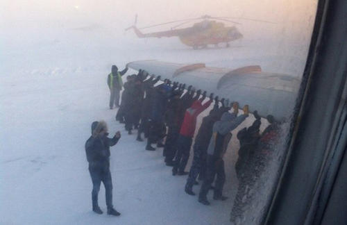 Las temperaturas de -52 grados en el aeropuerto de Igarka, provocaron que se congelara el sistema de frenos, lo que no fue obstáculo para suspender el vuelo. Al contrario, los pasajeros decidieron formar equipo a solicitud de la compañía y con mucha fuerza lograron mover el avión a empujones, en el video se pueden escuchar algunos gritos de en los que se animaban.