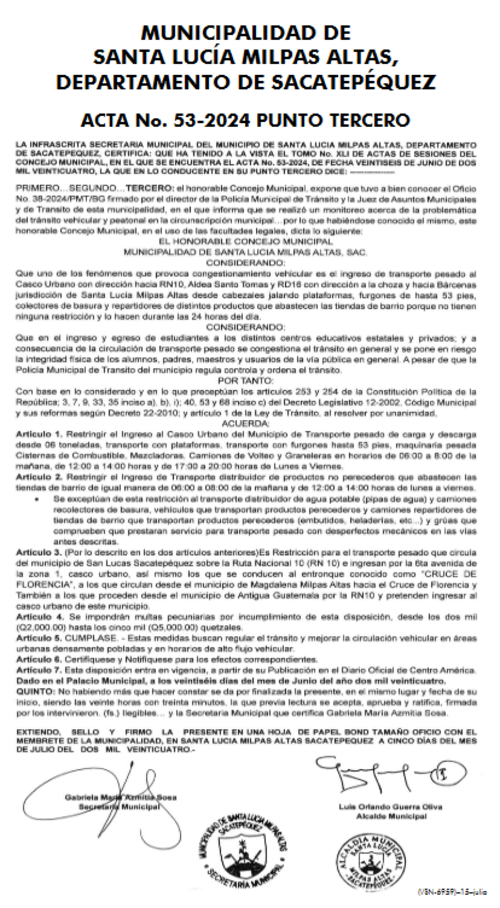 A partir del lunes 15 de julio, la Municipalidad de Santa Lucía Milpas Altas prohibió el paso de transporte pesado por la Ruta Nacional 10 mediante el acta municipal número 53-2024.