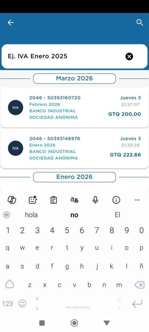 4. Filtros de búsqueda inteligente: Si posees un volumen alto de declaraciones, no es necesario buscarlas una por una. Presiona el icono de la lupa situado en la parte superior derecha. Aquí puedes escribir el nombre del impuesto (por ejemplo, "IVA" o "ISR") o bien el periodo específico (mes y año). El filtrado es instantáneo y muestra los resultados conforme escribes.