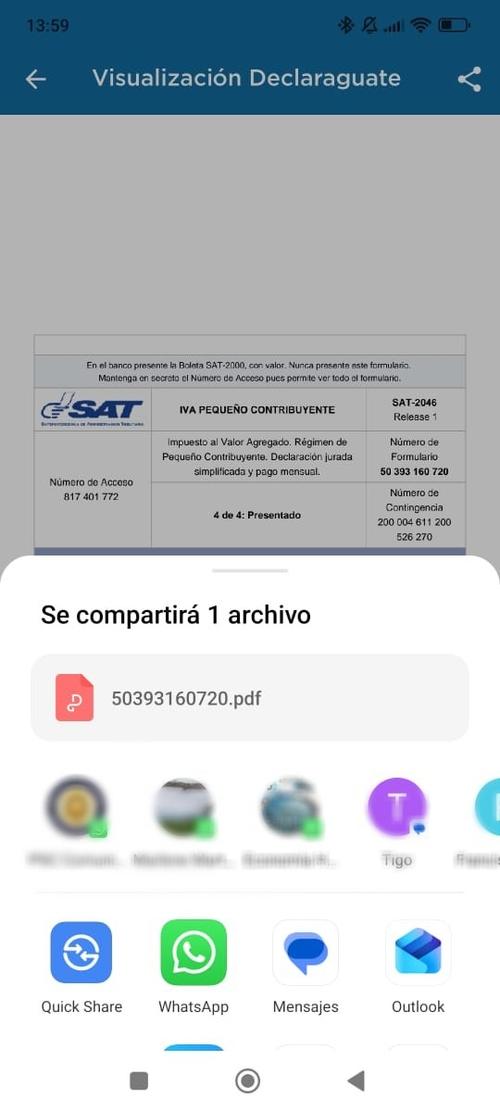 5. Gestión del documento Al seleccionar un formulario específico, se abrirá una vista previa con los detalles del pago y el número de formulario. Si necesitas enviarlo a tu contador, abogado o guardarlo en tu nube personal, presiona el botón "Compartir". Esto abrirá las opciones nativas de tu teléfono para enviarlo vía correo electrónico, WhatsApp o guardarlo como archivo PDF.