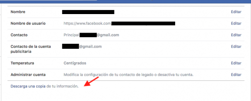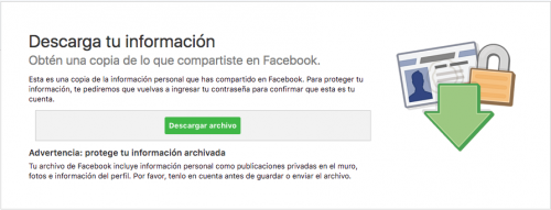 Inicialmente debes ir a "Configuración" y presionar la pestaña "Descargar una copia de tu información" con lo que te aparecerá la opción "Descargar archivo".