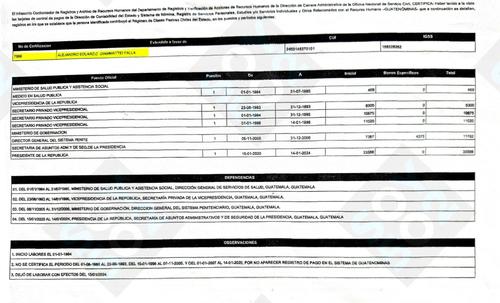 El último puesto en su récord laboral es como presidente de la República, el cual ostentó desde el 14 de enero de 2020 y la misma fecha de 2024, y el pago que le aparece es de Q33,588.