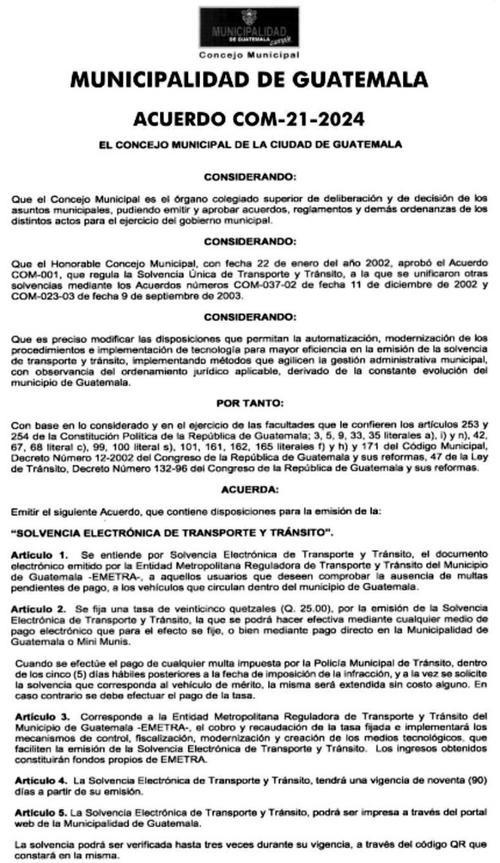 El costo de la Solvencia Electrónica de Transporte y Tránsito es de Q25. Además, tendrá una vigencia de 90 días a partir de su emisión.