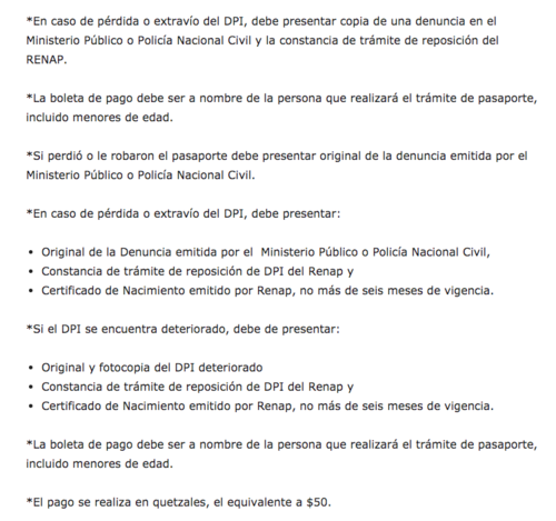Mientras que los menores de edad deberán portar el certificado de nacimiento reciente, DPI original y copia de los padres, boleto de ornato de uno de los padres con su respectiva copia, boleta de pago de 50 dólares realizado en Banrural y el pasaporte vencido. El menor de edad debe ir acompañado de ambos padres.