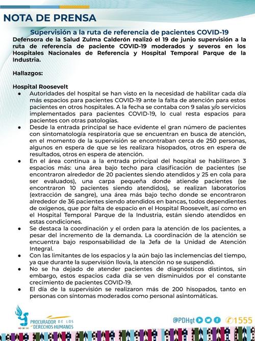 La Procuraduría de Derechos Humanos (PDH) hizo una verificación en el hospital temporal del Parque de la Industria y señaló que aún se encuentra pendiente la contratación de "al menos 100 médicos, entre especialistas y médicos