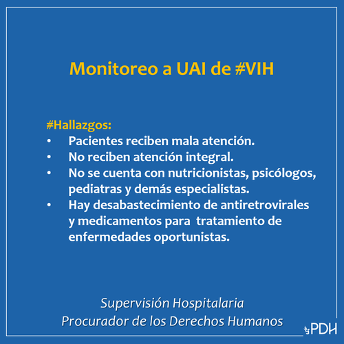 La medida obedece a que luego de un monitoreo realizado por la PDH a dichas Unidades de Atención Integral del IGSS se constató que los pacientes reciben mala atención, no cuentan con nutricionistas, psicólogos, pediatras y otros especialistas; así como el desabastecimiento de antirretrovirales y medicamentos para el tratamiento de enfermedades oportunistas.