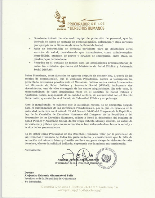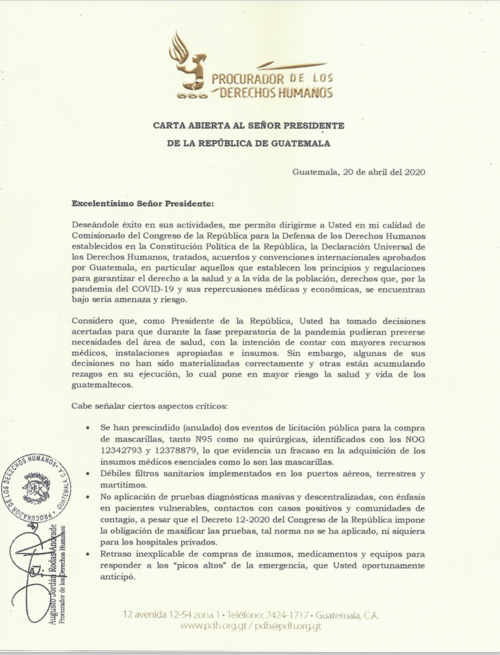 En una carta abierta el PDH describe 7 razones, que tienen relación con el manejo de la crisis por el Covid-19.