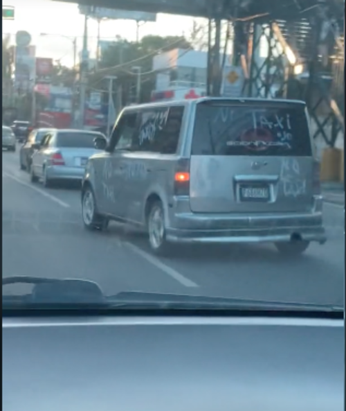 En la imagen se observa al auto estacionado en el parqueo de un centro comercial, pero aún así no pasó desapercibido por el curioso cartel: "No taxi, ojo", se lee.
