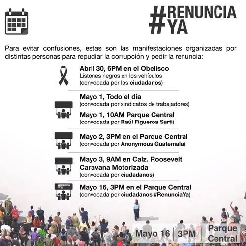 Los guatemaltecos conectados a redes sociales han visto que circula una convocatoria a manifestar su rechazo a la corrupción en el país el próximo sábado 25 de abril por medio de la etiqueta #RENUNCIAYA.