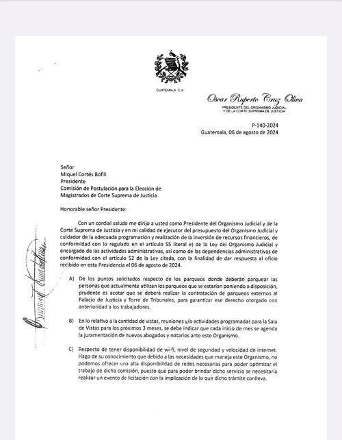 A esto se sumó la carta de Óscar Cruz, presidente del Organismo Judicial, quien indicó que la CSJ no contaba con el presupuesto para albergar a las comisiones.