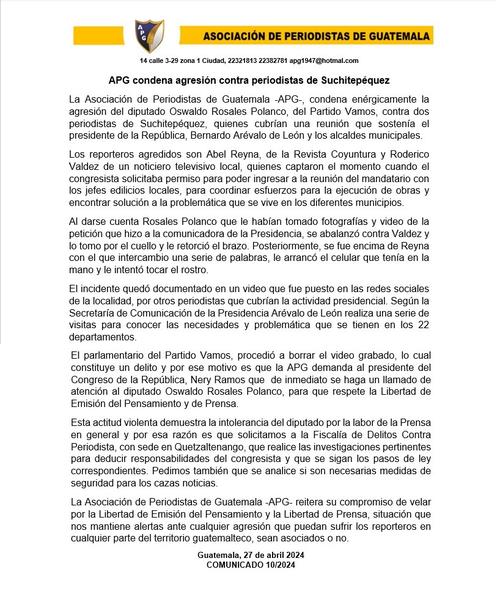 Después de conocer el caso, la Asociación de Periodistas de Guatemala (APG) se pronunció y pidió al Congreso aplicar sanciones contra Oswaldo Rosales.