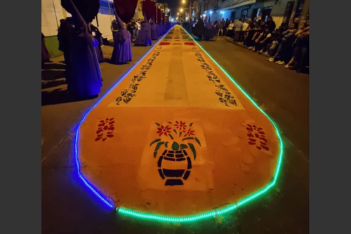 Este Lunes Santo se hizo viral una alfombra de aserrín que fue realizada para el recorrido de la procesión de Jesús de las Tres Potencias de la Parroquia Vieja en zona 6.