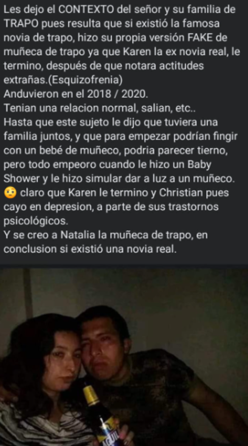 Más allá de ello, en redes sociales salió a la luz que hace años el hombre sufrió problemas de depresión tras haber vivido una ruptura amorosa, luego de que le dijo a su novia de la vida real de ese entonces que formaran una familia y que tuviesen un atípico hijo de muñeco; pero ella prefirió alejarse de él.