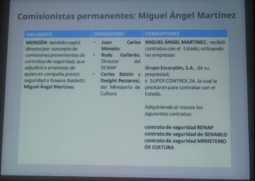Aunque no se especificó el monto de las ganancias que habría recibido la estructura, se dio a conocer que el desvío de fondos se hizo a través de la adjudicación de contratos de seguridad a Grupo Escorpión, una empresa de Miguel Ángel Martínez, quien prestó seguridad a Baldetti durante su campaña electoral.