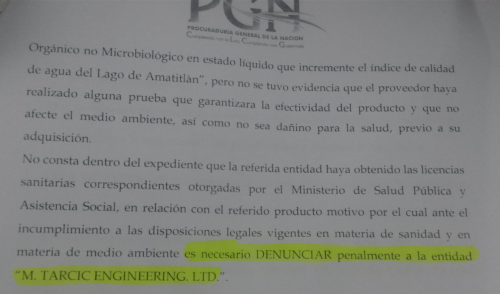La Procuraduría General de la Nación pidió, en la denuncia penal contra M Tarcic Engineering, que también se investigue a los funcionarios que no solicitaron el estudio de impacto ambiental de la fórmula con la que se pretendía limpiar el lago de Amatitlán.
