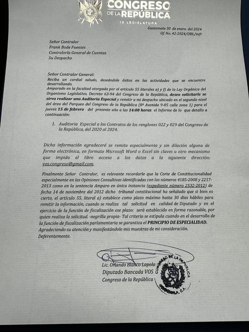 Específicamente, solicitó auditar los "contratos de los renglones 022 y 029 del Congreso de la República, del 2020 al 2024".