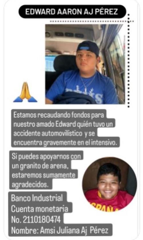 Familiares y amigos de Edward Aaron Aj Pérez de 15 años solicitan ayuda económica para poder solventar gastos médicos, debido a que el menor resultó herido durante un aparatoso accidente de tránsito, ocurrido la noche del domingo 11 de junio, en la calzada San Juan.