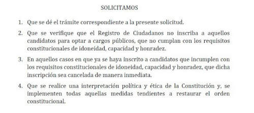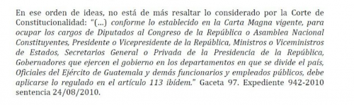 La petición de las 17 organizaciones que conforman el Foro Guatemala se basa en el artículo 113 de la Constitución de la República. En este se explica que los guatemaltecos que opten a un cargo público pueden acceder a él por “méritos de capacidad, idoneidad y honradez“. Han presentado, además, un antecedente de la Corte de Constitucionalidad para que este pueda ser aplicado.