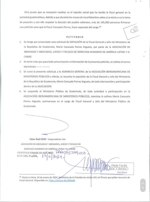 Además proponen que el Ministerio Público (MP) sea suspendido de participar en actividades en dicha asociación, mientras Porras permanezca en el cargo de fiscal general y jefa de esa dependencia del Estado.