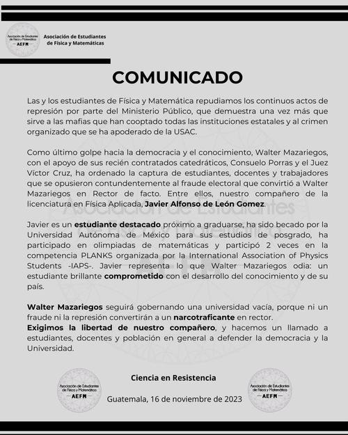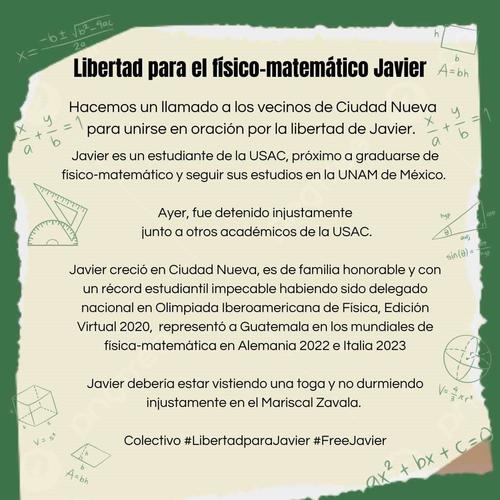 "Estaba próximo a irse a estudiar a la Universidad Nacional Autónoma de México (UNAM) en donde obtuvo una beca. Javier creció en Ciudad Nueva, es de familia honorable y con un récord estudiantil impecable habiendo sido delegado nacional en Olimpiada Iberoamericana de Física, Edición Virtual 2020, ademas representó a Guatemala en los mundiales de física-matemática en Alemania 2022 e Italia 2023", se lee en un comunicado compartido por vecinos del alumno, quienes piden su liberación.