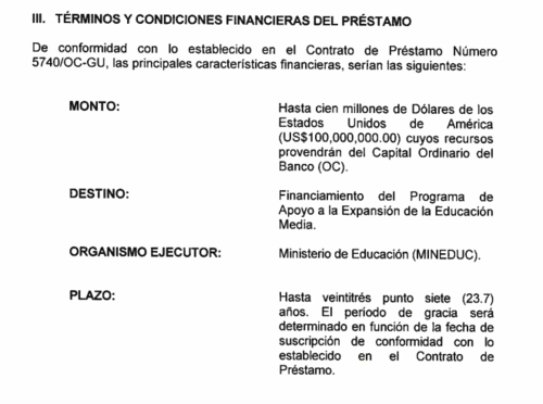 En la iniciativa 6311 se hace referencia a un empréstito con el BID, por 100 millones de dólares, es decir, Q782 millones, para la implementación de un programa para la expansión de la educación media.