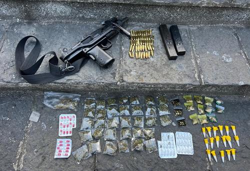 Según el reporte oficial, al notar la presencia policial intentó escapar, pero fue interceptado. Durante la inspección, se le incautó una subametralladora Mini Uzi calibre 9 mm, dos tolvas, 49 municiones, 47 bolsas con marihuana, 24 cápsulas y 17 envoltorios con cocaína, así como dos blísteres con presunto crack.