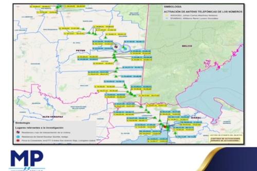 El MP presentó como evidencia la activación de antenas de los celulares de los capturados que coincide con el horario del secuestro. (Foto: MP/Soy502)