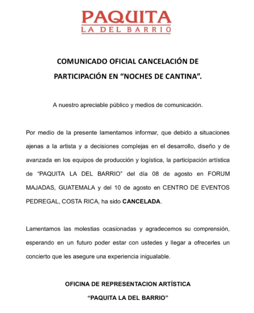 "Debido a situaciones ajenas a la artista y a decisiones complejas en el desarrollo, diseño y de avanzada en los equipos de producción (...), la presentación de Paquita la del Barrio ha sido cancelada", se lee en el escrito.