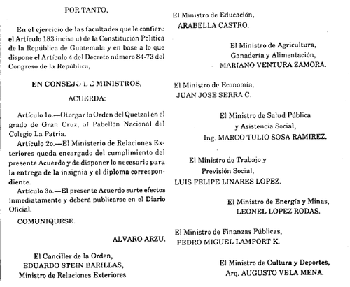 Sin embargo, el Decreto número 84-73 del Congreso de la República publicado en 1999 estipula lo siguiente: "El Ministerio de Relaciones Exteriores queda encargado del cumplimiento del presente Acuerdo y de disponer lo necesario para la entrega de la insignia y el diploma correspondiente".
