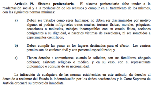 El artículo 19 de la Constitución Política de la República prohíbe que los privados de libertad sean sometidos a torturas físicas o tratos denigrantes a su dignidad, entre lo que podría incluirse la castración quirúrgica.