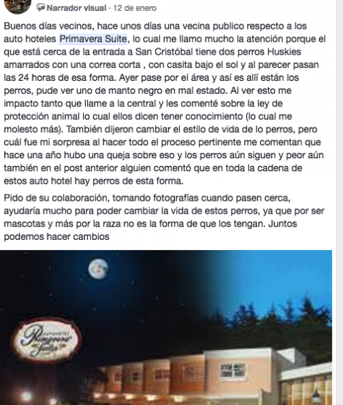Los guatemaltecos y asociaciones de bienestar animal han comentado sobre los canes que se mantienen al ingreso del autohotel Primavera Suites en la ruta Interamericana. El tema ha dado de qué hablar en los últimos meses entre usuarios de Facebook que buscan rescatar a los canes de raza Husky siberiano.