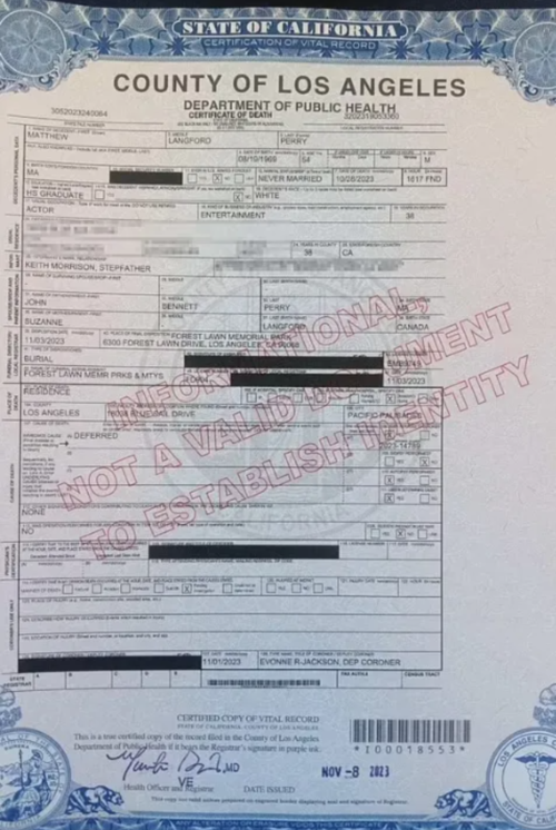 El Departamento de Policía de Los Ángeles dio a conocer el certificado de defunción de Matthew Perry, revelando algunos detalles sobre el fallecimiento.