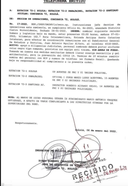 El documento refiere que los elementos de la PNC deben estar presentes en el kilómetro 162.7 de la ruta Interamericana, el viernes 7 de enero de 2022.