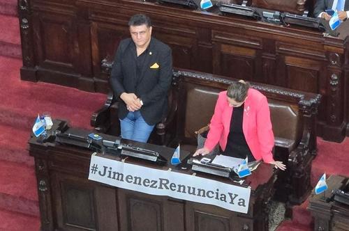 Una de ellas es del cartel que colocó Jovel frente a su curul, en el cual pidió la renuncia de Jiménez. De hecho, desde que comenzó la jornada de este día, la legisladora le dijo directamente al ministro que dejara el cargo.