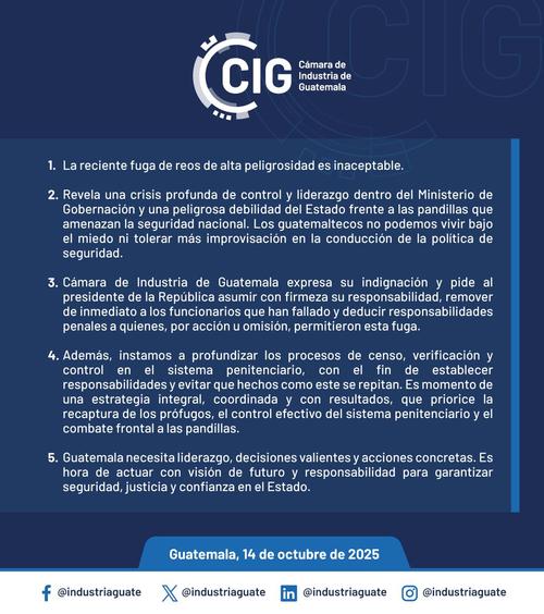 Este martes 14 de octubre la Cámara de Industria de Guatemala (CIG) pronunció su inconformidad por el silencio del presidente Bernardo Arévalo tras la fuga de 20 reos del Centro de Detención Fraijanes II.