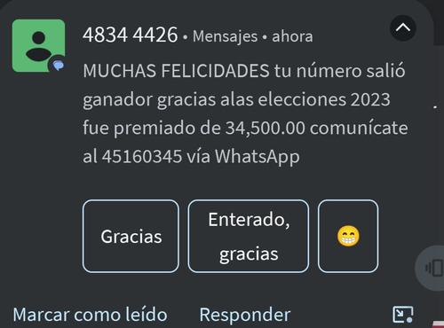 "Muchas felicidades tu número salió ganador gracias a las elecciones 2023 fue premiado de 34,500.00 comunícate al 45160345 vía WhatsApp", según indica el texto.