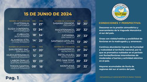 Para este sábado 15 de junio, el Instituto Nacional de Sismología, Vulcanología, Meteorología e Hidrología (Insivumeh) pronostica un descenso en la presión atmosférica y acercamiento de la Vaguada Monzónica al sur del país.