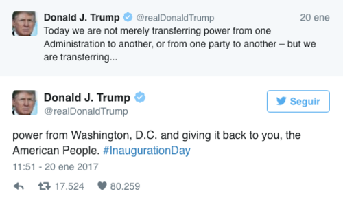 "Hoy no solamente estamos transfiriendo el poder de una administración a otra o de un partido a otro, estamos transfiriendo el poder de Washington D.C. y dandolo de regreso a ustedes los Estadounidenses", afirma en este post.