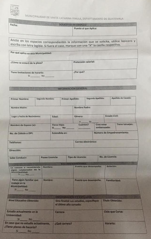 Vecinos de Santa Catarina Pinula se han quejado de que los formularios para solicitar trabajo en la