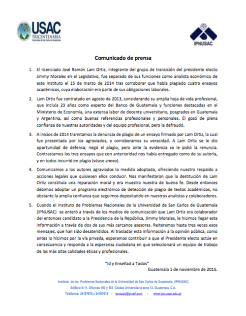 José Ramón Lam, principal asesor financiero del presidente electo, Jimmy Morales, es acusado de haber plagiado, al menos, 4 informes cuando trabajaba para el Instituto de Problemas Nacional de la Universidad de San Carlos (Ipnusac), razón por la que fue despedido de esa institución.