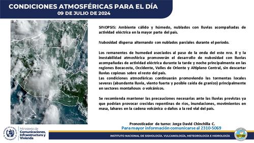 Para la noche de este martes 9 de julio, el Instituto Nacional de Sismología, Vulcanología, Meteorología e Hidrología (Insivumeh) informó que continuará las condiciones de ambiente cálido y húmedo.
