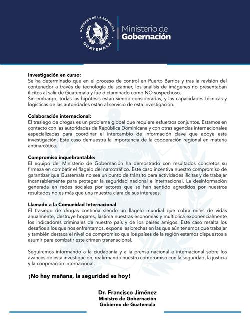 En su pronunciamiento, el Mingob reitera una comunicación previa de la Secretaría de Comunicación Social de la Presidencia, al indicar que "en el proceso de control en Puerto Barrios y tras la revisión del contenedor a través de tecnología de scanner, los análisis de imágenes no presentaban ilícitos al salir de Guatemala".