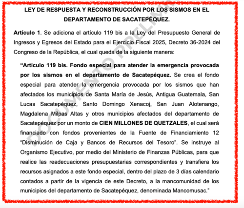 Marco Pérez y otros diputados de Vamos presentaron una iniciativa de ley que modificaría el Presupuesto General de la Nación y crearía un fondo de Q100 millones para atender a los municipios de Sacatepéquez afectados por la reciente secuencia sísmica